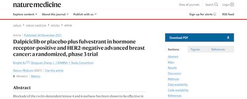 11月4日,国际四大医学期刊之一、英国《自然》旗下《自然医学》(Nature Medicine)在线发表CDK4/6抑制剂达尔西利(SHR6390)联合氟维司群治疗既往内分泌治疗后疾病进展的HR+/HER2-晚期乳腺癌的多中心、随机、双盲III期临床研究(DAWNA-1研究)中期分析结果报告,首次对氟维司群(雌激素受体降解剂)±达尔西利治疗激素受体阳性晚期乳腺癌的有效性和安全性进行了比较。研究结果显示,达尔西利+氟维司群组与安慰剂+氟维司群组相比,无进展生存期(PFS)显著延长。该项研究由中国医学科学院肿瘤医院徐兵河教授担任leading PI,全国39家医院参研,由九游会医药临床研发团队支持完成。