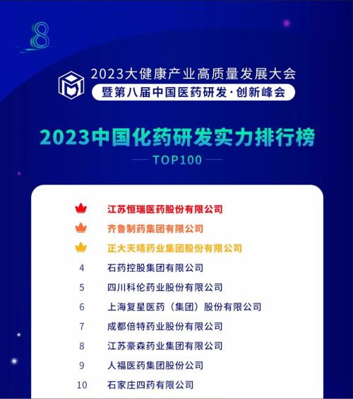 由药智网、中国药业杂志社主办的2023大健康产业高质量发展大会暨第八届中国医药研发•创新峰会于6月16日开幕,会上发布了《2023中国药品研发实力排行榜》系列榜单,九游会医药凭借深厚的创新研发实力再创辉煌:荣登《2023中国药品研发综合实力排行榜TOP100》榜首、《2023中国化药研发实力排行榜TOP100》榜首。值得一提的是,今年是九游会医药连续第6年入选《中国药品研发综合实力排行榜》榜首。